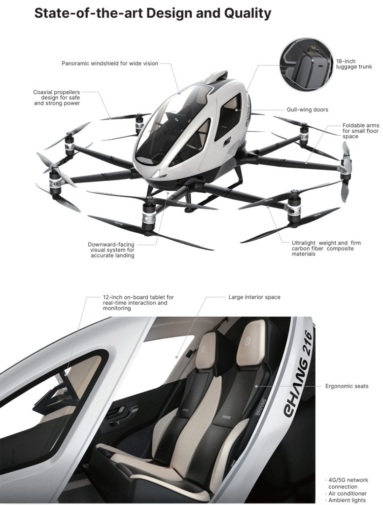 The EHang 216 takes a totally different approach: full autonomy. No joystick, no piloting—just pick your destination on a screen and let the aircraft do the work.